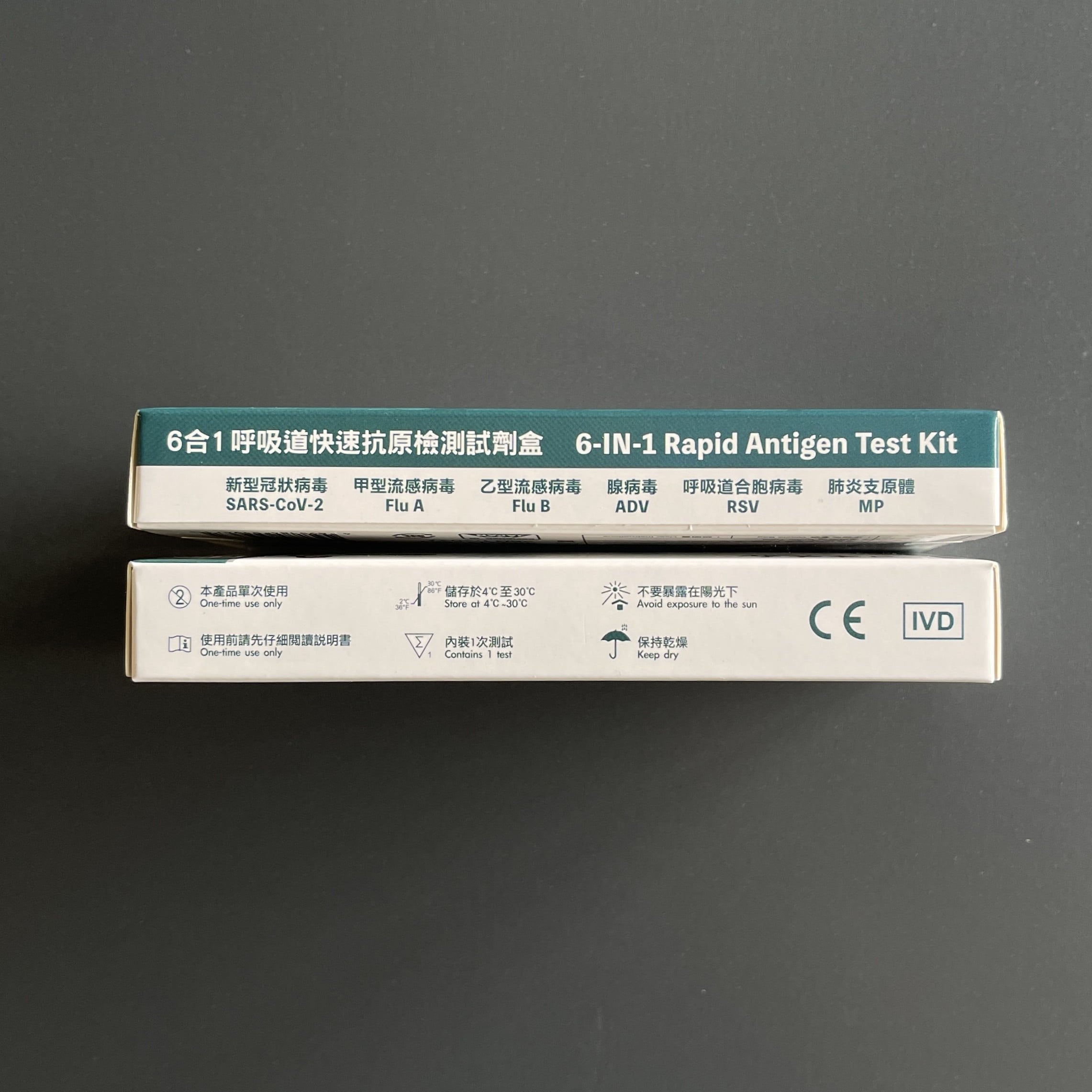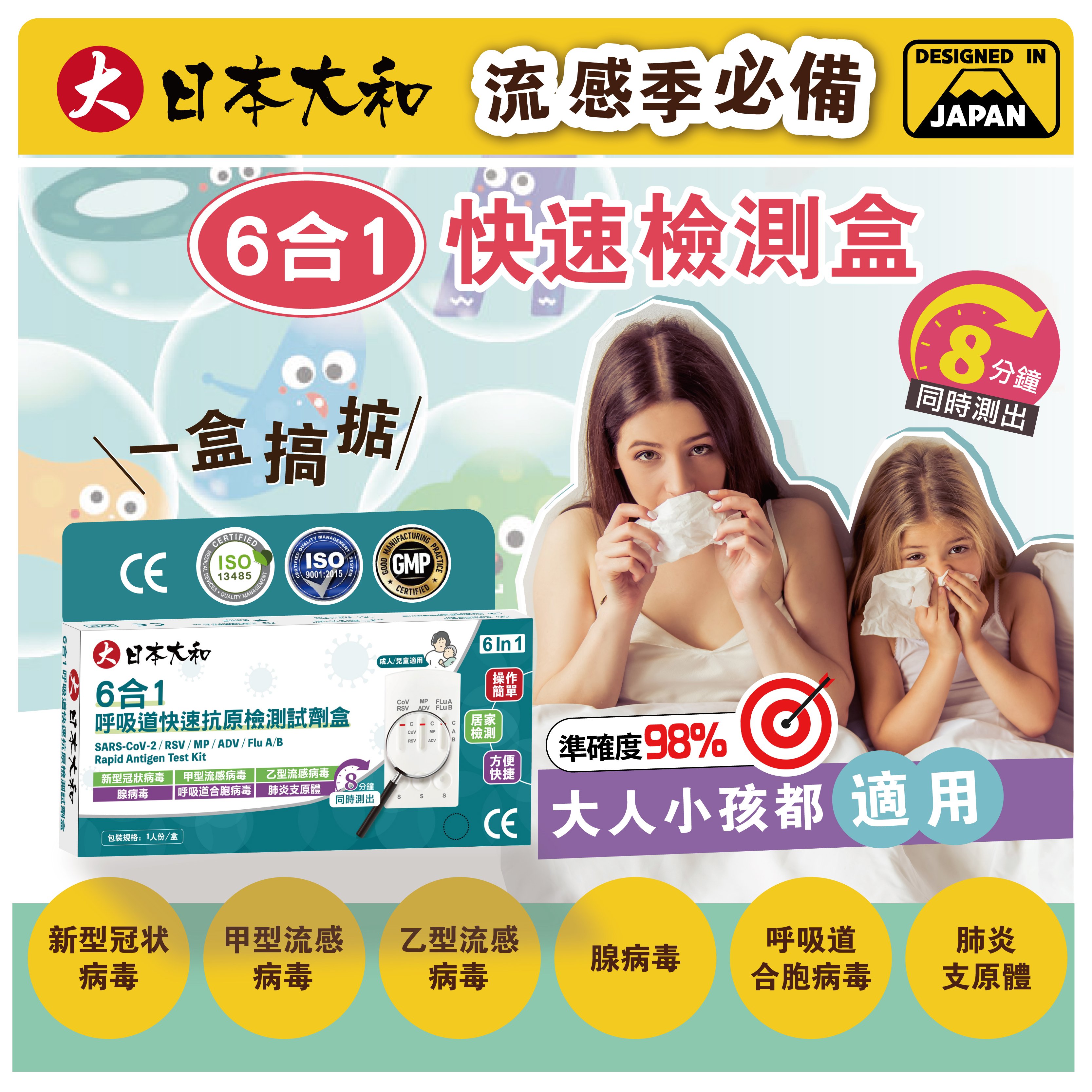日本大和-(1盒) (6合1)新冠病毒/甲/⼄型流感/RSV合胞/ADV腺病毒/MP&Flu肺炎快速抗原檢測試劑盒(獨立包裝)