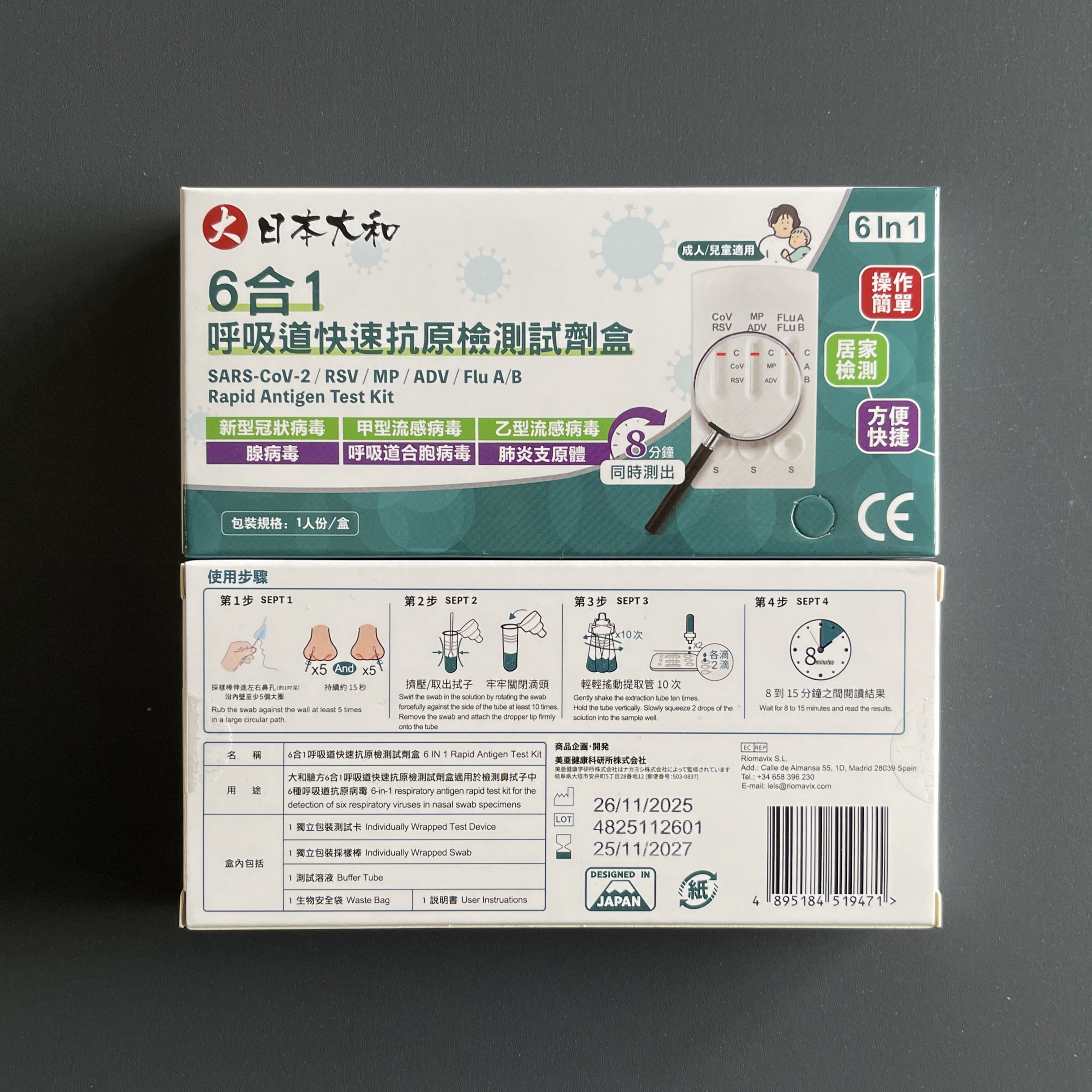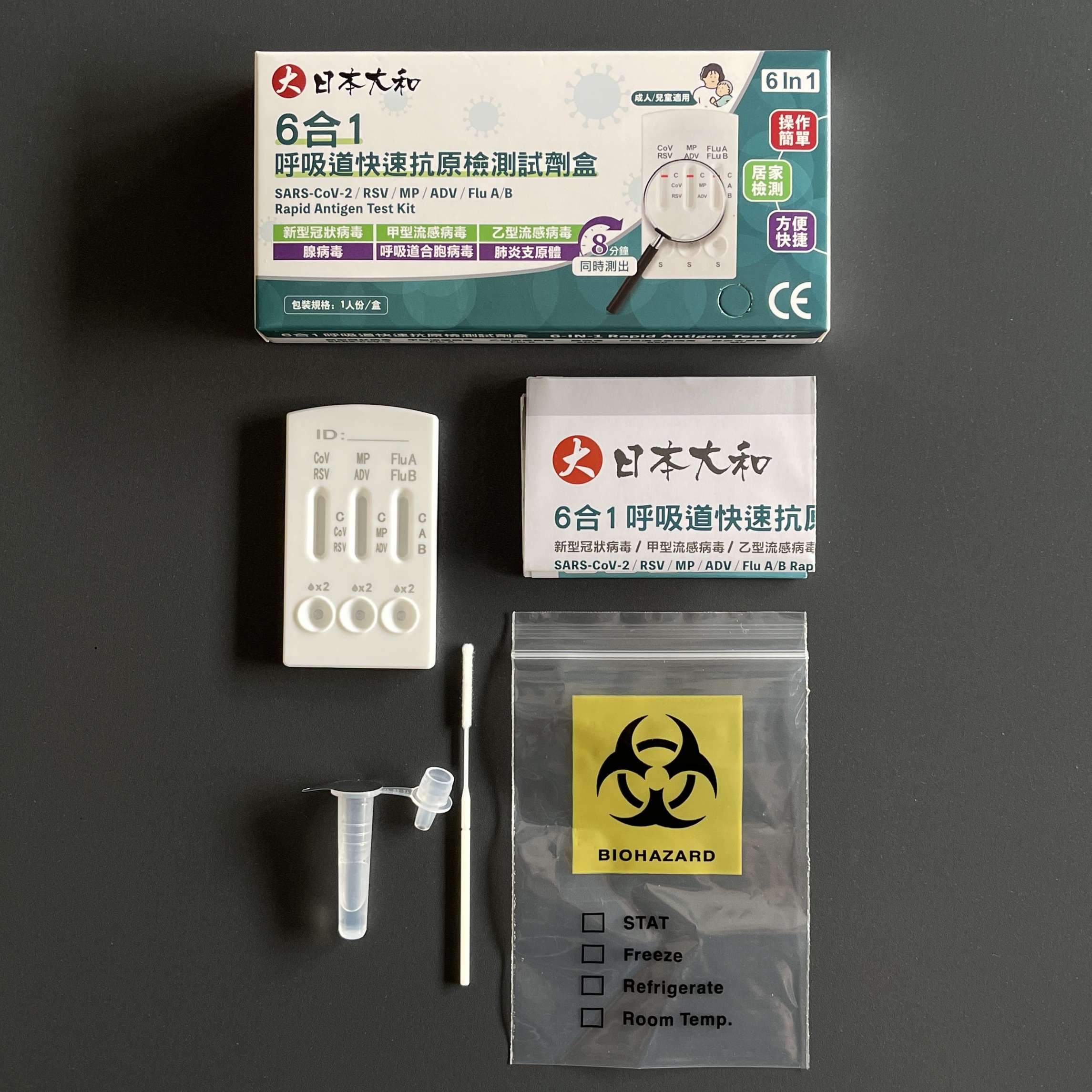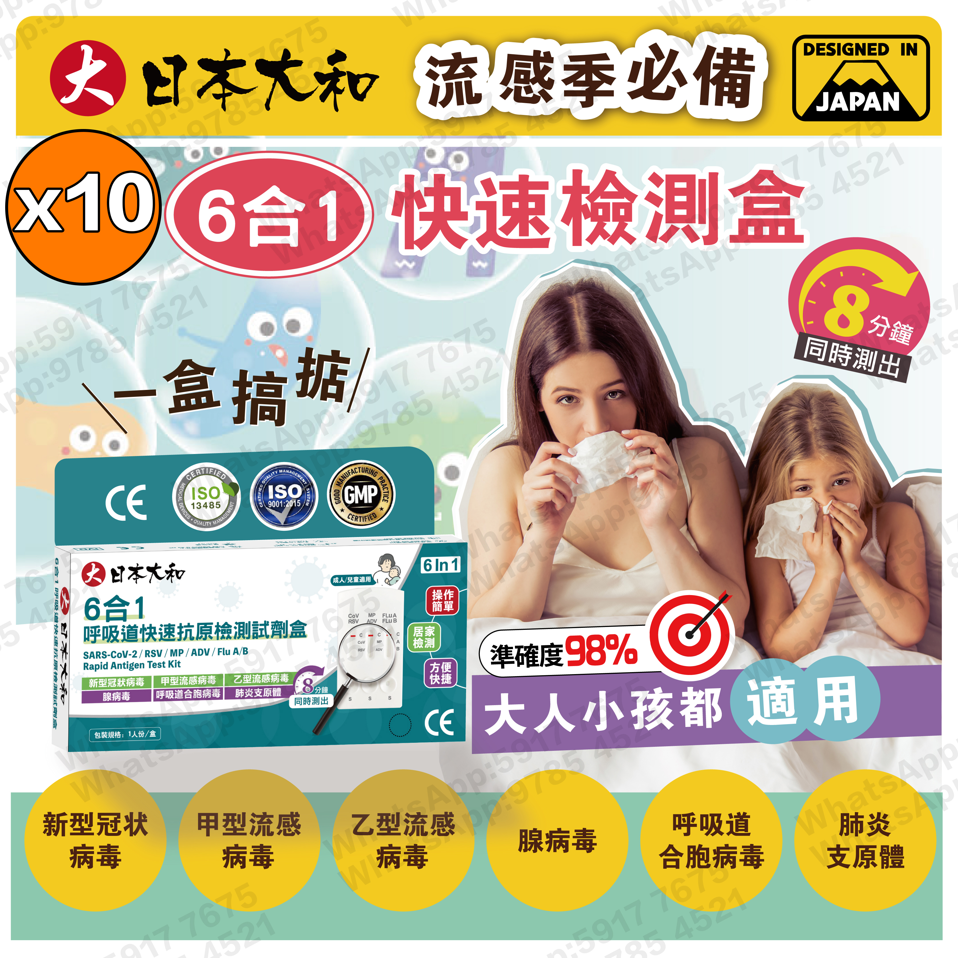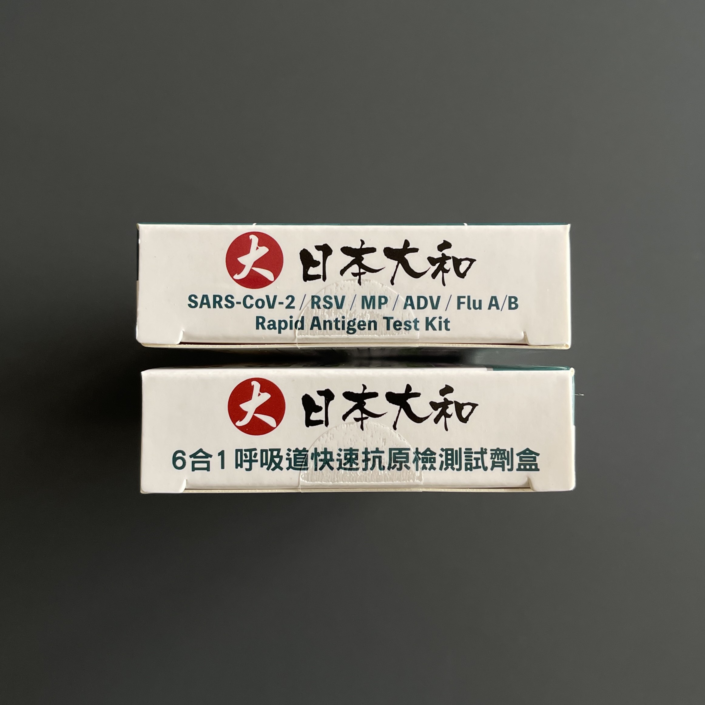 日本大和-(10盒) (6合1)新冠病毒/甲/⼄型流感/RSV合胞/ADV腺病毒/MP&Flu肺炎快速抗原檢測試劑盒(獨立包裝)