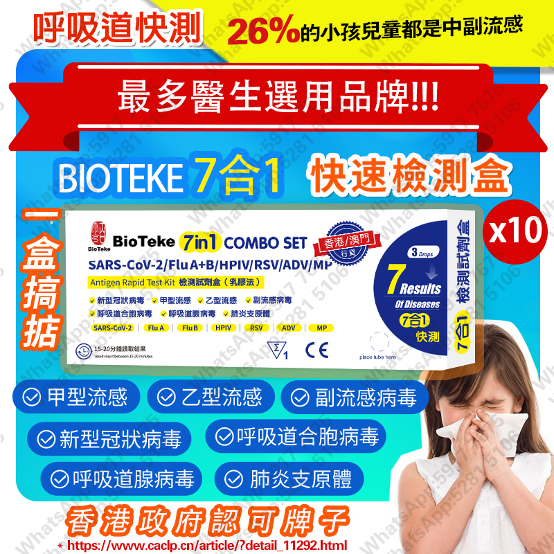 BIOTEKE-(7合1)新型冠状病毒、甲型+乙型流感、副流感病毒、呼吸道合胞病毒、 呼吸道腺病毒、肺炎支原体抗原检测试剂盒(乳胶法)10支