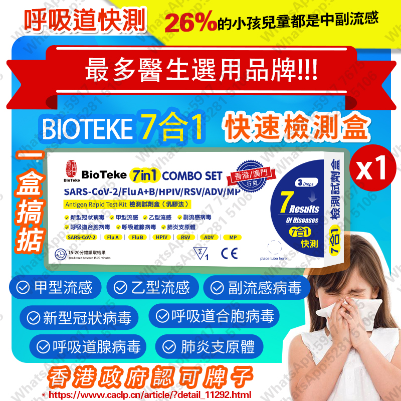 BIOTEKE-(7合1)(5支)新型冠状病毒、甲型+乙型流感、副流感病毒、呼吸道合胞病毒、 呼吸道腺病毒、肺炎支原体抗原检测试剂盒(乳胶法) (包裝隨機)【額外加送拭子適合兒童採樣用】