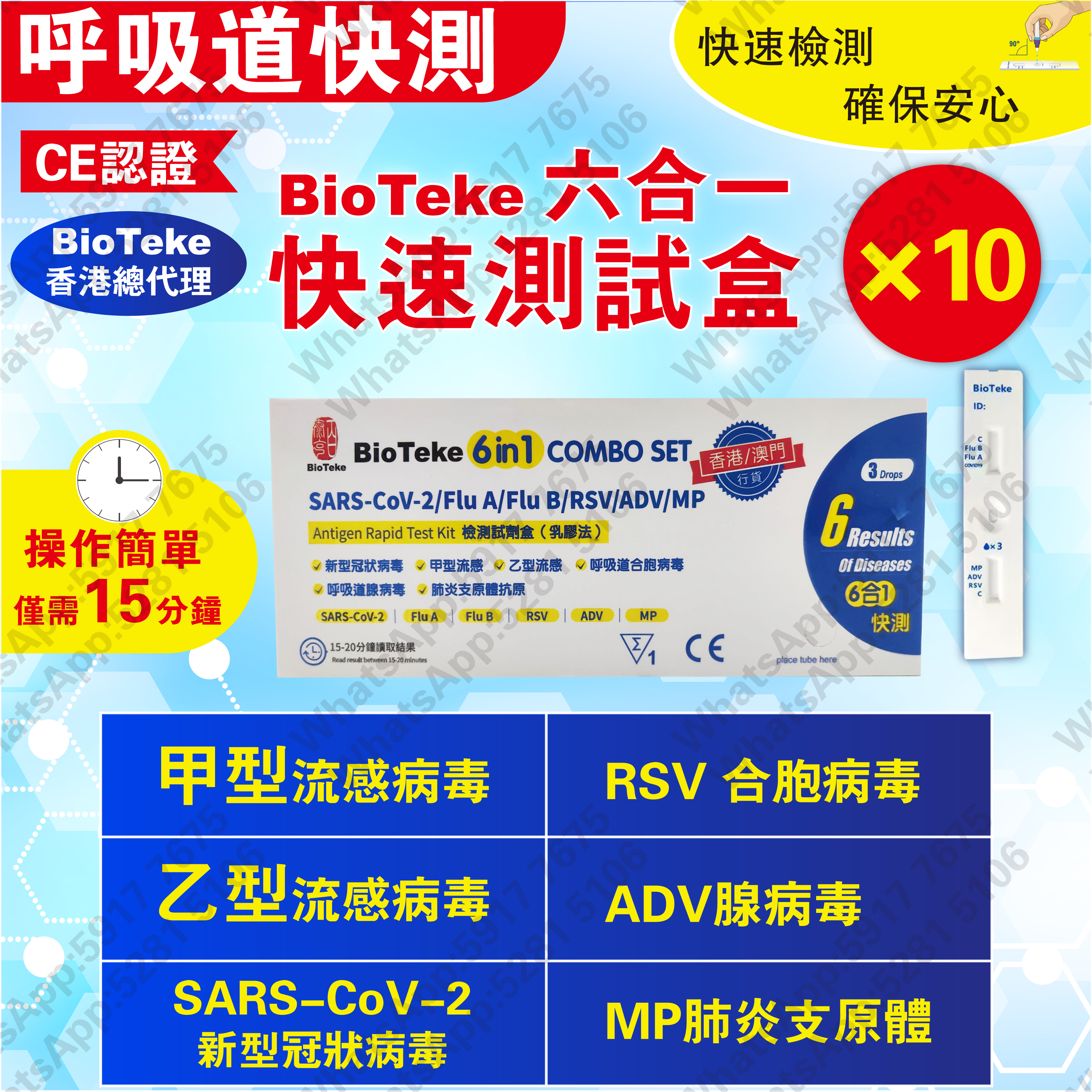 BIOTEKE-6合1 新冠病毒/甲/⼄型流感/RSV合胞/ADV腺病毒/MP&Flu肺炎快速抗原檢測試劑盒 10支(獨立包裝)(新舊包裝隨機發出)